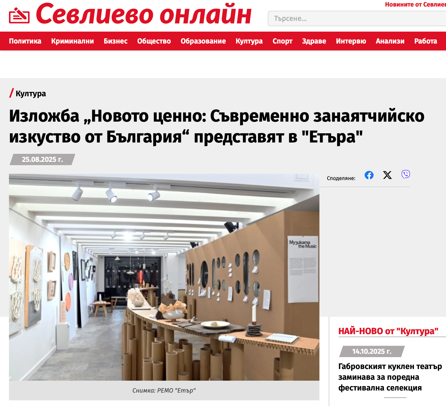 В Музейния център на РЕМО „Етър“ е представена изложбата „Новото ценно: Съвременно занаятчийско изкуство от България“, която може да бъде разгледана до 15 ноември 2025 г.
