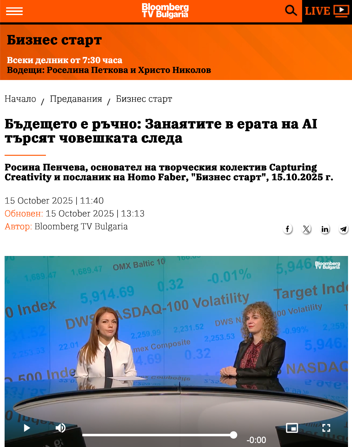 15.10.2025, Росина Пенчева, основател на творческия колектив Capturing Creativity и посланик на Homo Faber, "Бизнес старт"