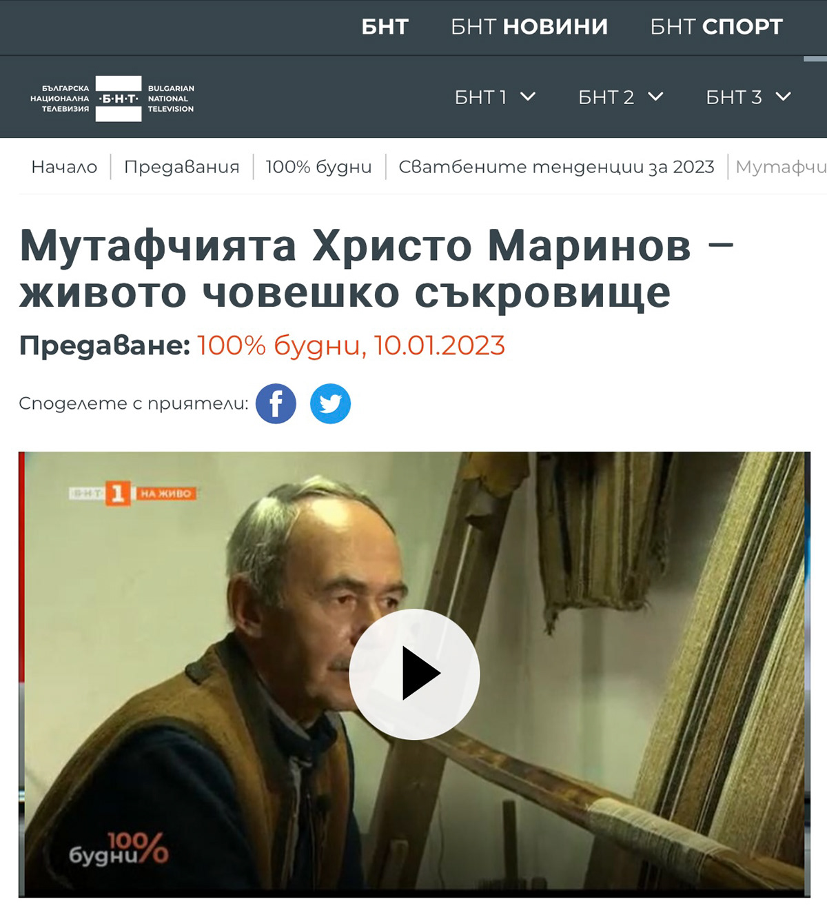 10.01.2023, предаване 100% будни, БНТ 1, водещи: Стефан Щерев и Надя Иванова, репортаж на: Нина Янакиева, гост в репортажа: Христо Маринов