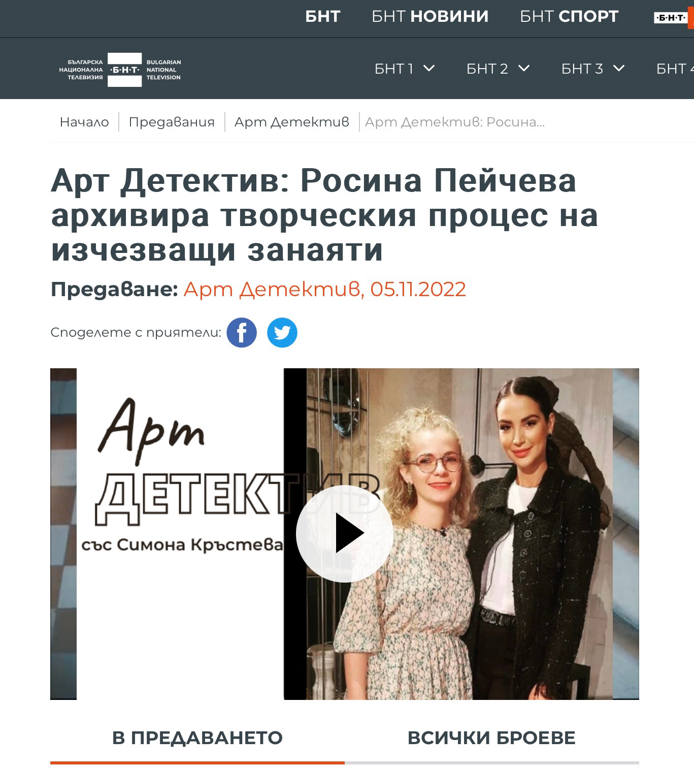 05.11.2022, предаване „Арт Детектив”, БНТ 2, водещ: Симона Кръстева, гост: Росина Пенчева