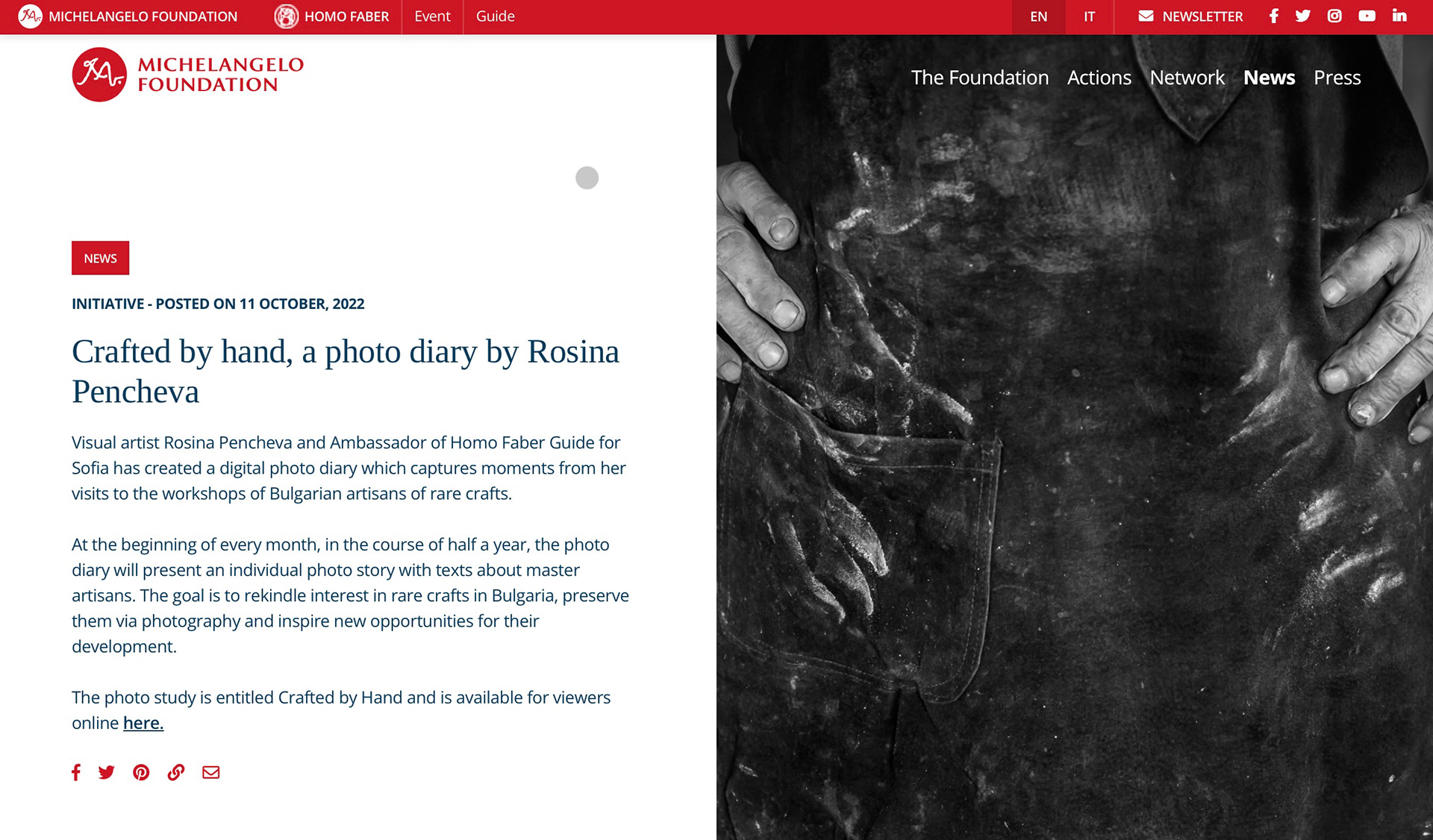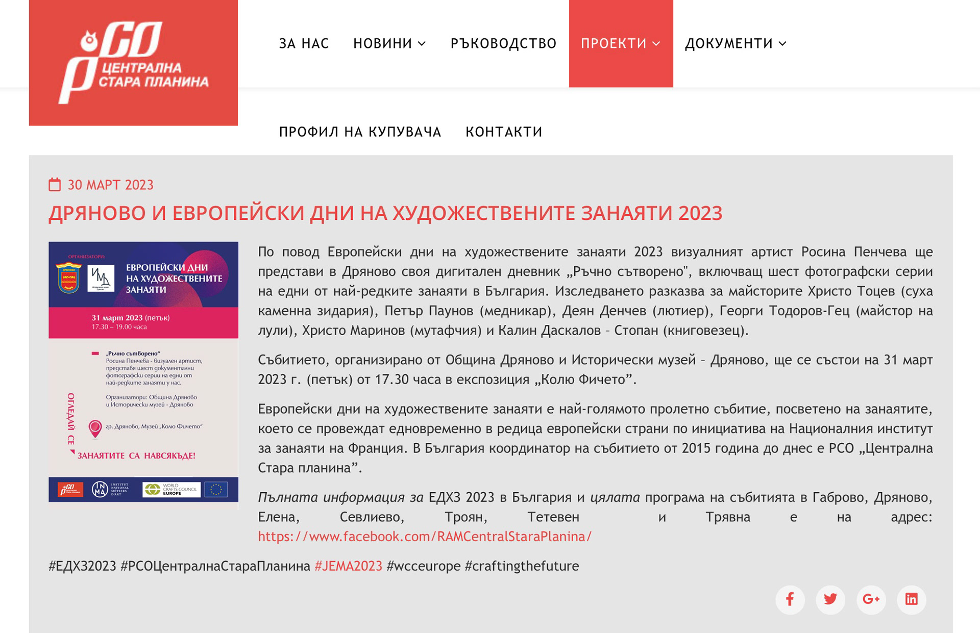 По повод Европейски дни на художествените занаяти 2023 визуалният артист Росина Пенчева ще представи в Дряново своя дигитален дневник „Ръчно сътворено", включващ шест фотографски серии на едни от най-редките занаяти в България.