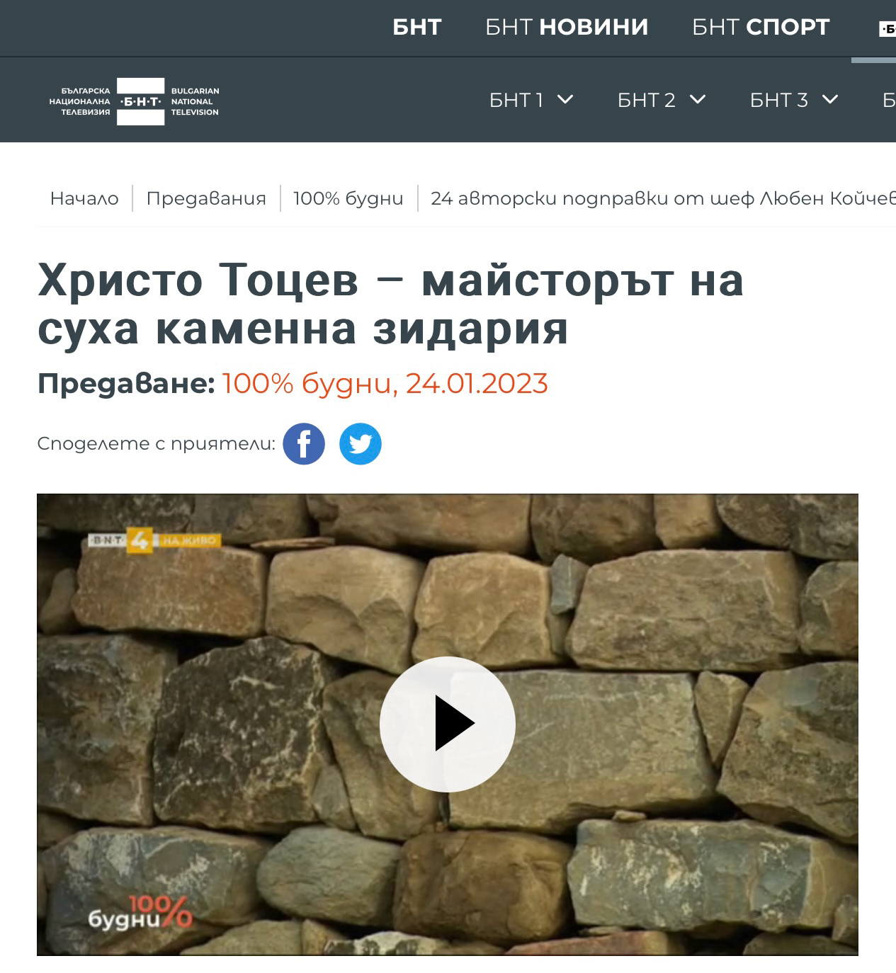 24.01.2023, предаване 100% будни, БНТ 1, водещи: Стефан Щерев и Надя Иванова, репортаж на: Нина Янакиева, гост в репортажа: Христо Тоцев