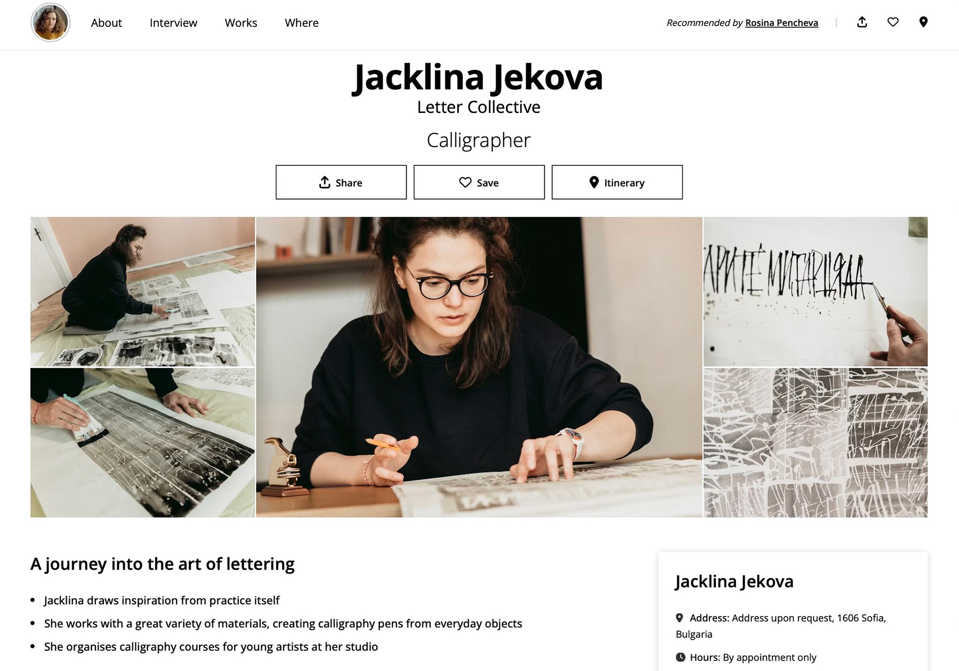 Росина Пенчева, която е единствената личност-посланик за България в движението Хомо Фабер, препоръчва калиграфката за включване в пътеводителя и предоставя фотографии за профила ѝ. Част от кадрите са от дигиталния фотопроект на Росина Без публика от 2021 г., в който Жаклина е един от главните герои.