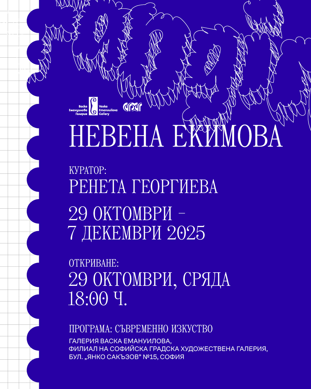 Галерия „Васка Емануилова“ представя самостоятелна изложба на художничката Невена Екимова в рамките на програмата „Съвременно изкуство“. Събитието е част от специалната изложбена програма, с която се отбелязва 120-годишнината от рождението на Васка Емануилова.