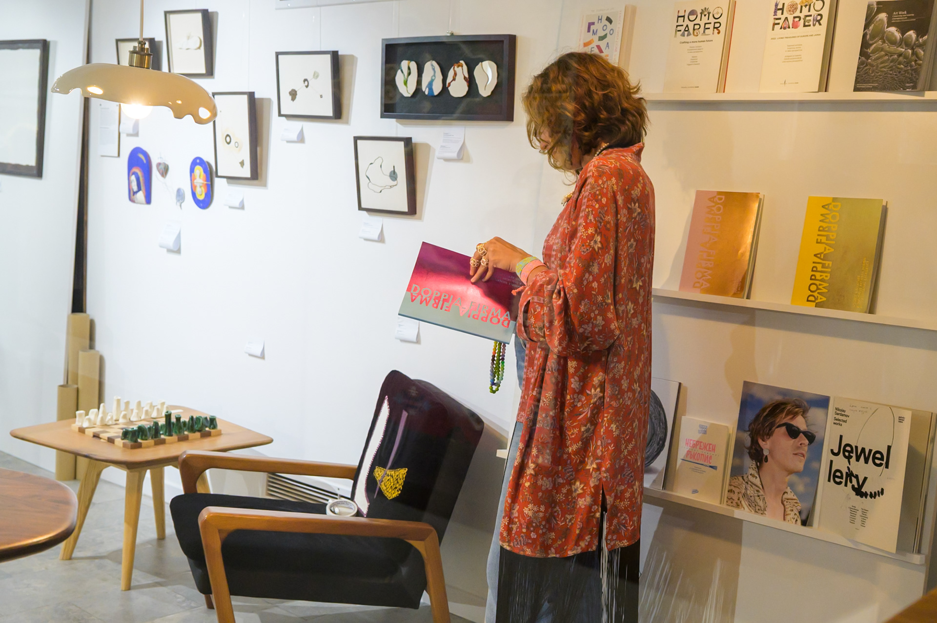 Обзаведено пространство с мебели от изложбата и зона за разглеждане на каталози, предоставени от участниците и партньорите и кураторът.